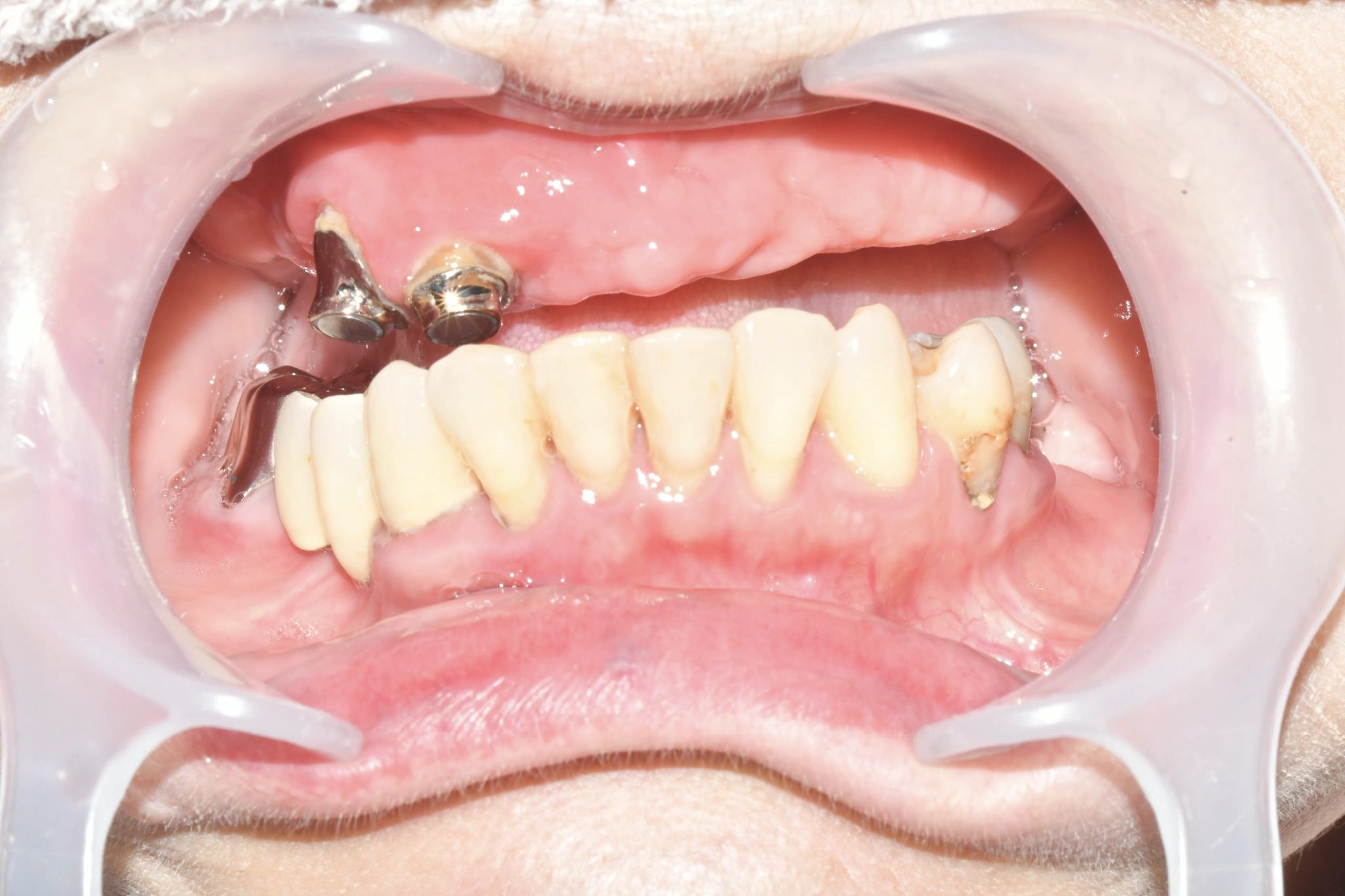磁石固定式の義歯を使用していましたが、頻繁に外れる上に痛みも伴い、機能的に限界を感じていました。特に、仕事柄「味見」をする必要があるのですが、義歯では満足に味を確かめることができず、支障が出ていました。食事の際も、食べ物が当たる度に歯茎に痛みもあり、日常生活においても深刻な悩みを抱えていました。